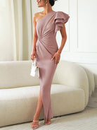 هذه الفستان الطويل يتميز بقصّة انسيابية مع كتف مكشوف. تضيف الدرجات المتراكبة والشق الجانبي لمسة من الرقي. مثالي للزفاف والسهرات والمناسبات الرسمية الأخرى.