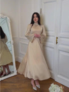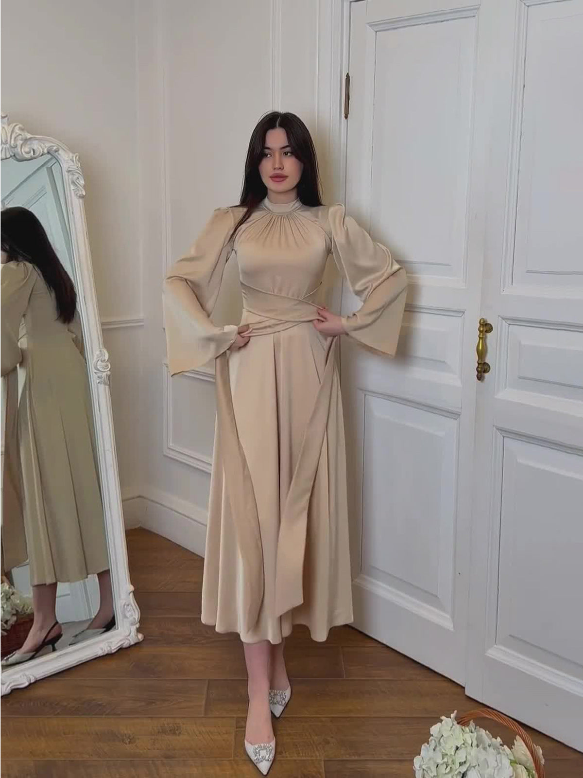 تجسد هذه الفستان الطويل الرقي مع ياقة عالية، وأكمام طويلة، وقصّة انسيابية. تسمح الحزام المدمج بتحديد الخصر برقة، مما يضيف هيكلًا وأنوثة. مثالية لمناسباتك الخاصة، تجمع بين الراحة، والأناقة، والبساطة.