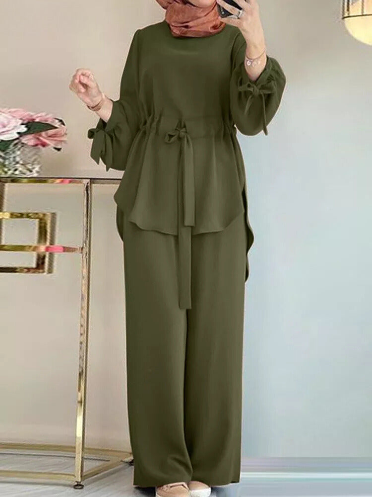 Πολυδιάστατο και κομψό, αυτό το σετ δύο τεμαχίων συνδυάζει άνεση και στυλ. Αποτελούμενο από μια μακριά τοπ και ένα ρέον παντελόνι, είναι κατάλληλο τόσο για επίσημες εξόδους όσο και για καθημερινές στιγμές.