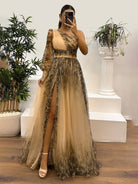 אדלין | שמלת תחרה ארוכה מודפסת בפרחים עם שסע – אלגנטיות ועידון