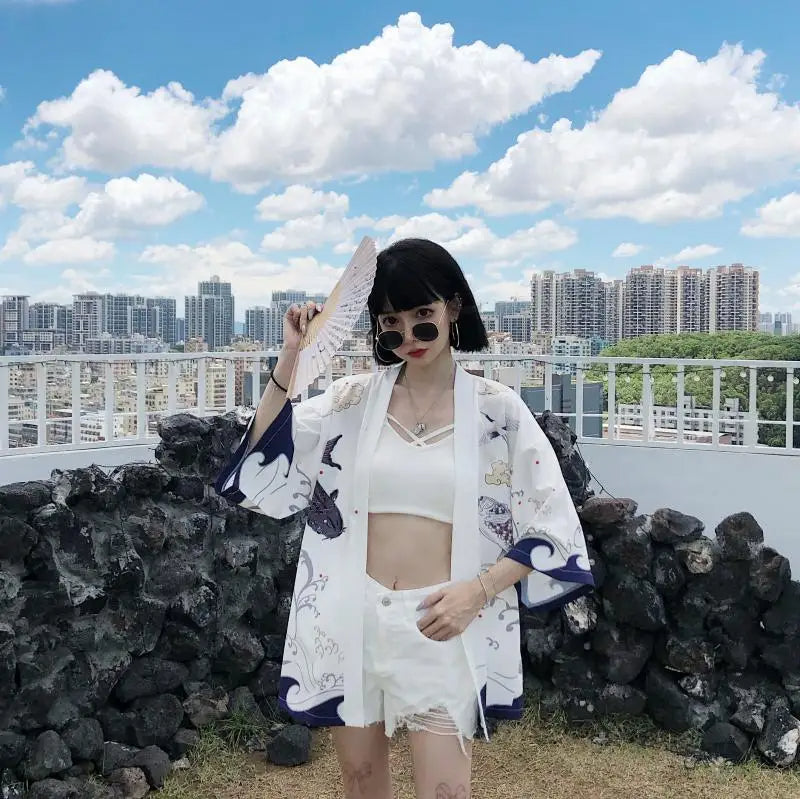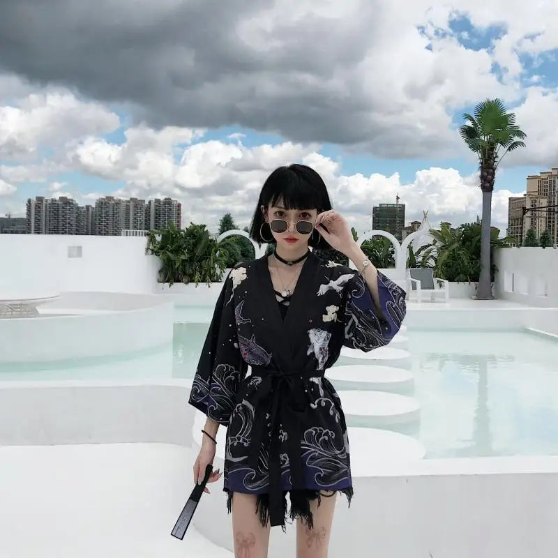この女性用の着物ジャケットは、日本の鳥を描いた洗練されたプリントで飾られています。これは調和と優雅さの象徴です。ゆったりとした流れるようなシルエットは、カジュアルなルックにもフォーマルなスタイルにも完璧な快適さを提供します。