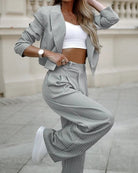Tämä asukokonaisuus yhdistää rakenteellisen bleiserin yhteensopiviin housuihin. Se tarjoaa elegantin ja ammattimaisen siluetin. Täydellinen toimistoon tai virallisiin tilaisuuksiin.