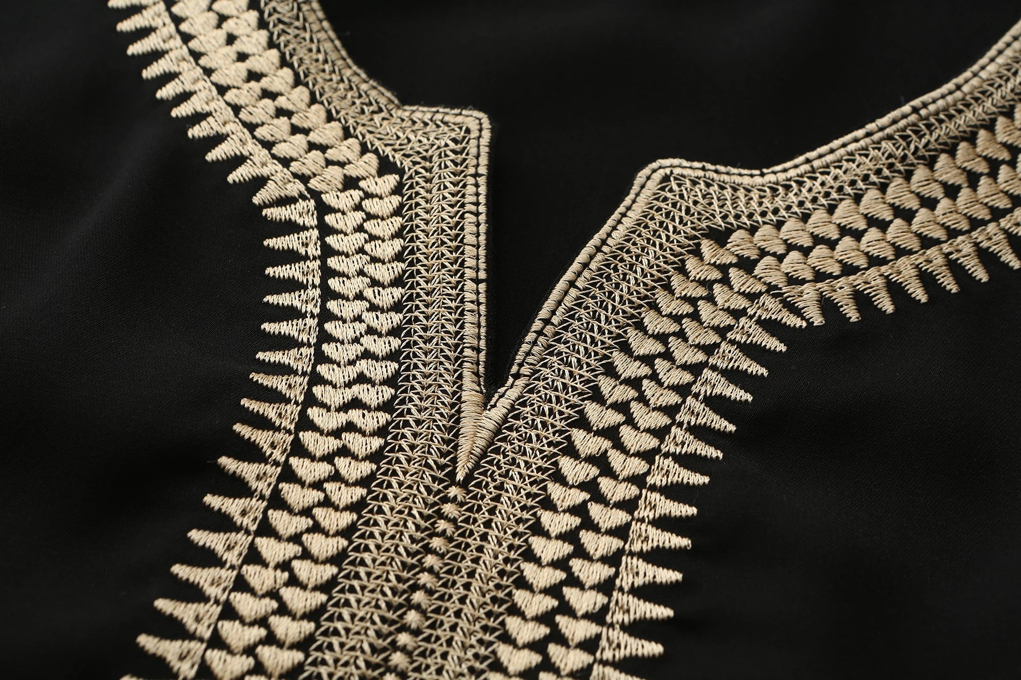 Această thobe neagră de stil marocan se remarcă prin broderiile sale aurii atent lucrate și aspectul său majestuos. Croiala sa largă asigură o mare libertate de mișcare, păstrând în același timp o siluetă elegantă. Perfectă pentru sărbători, rugăciuni sau ieșiri elegante.